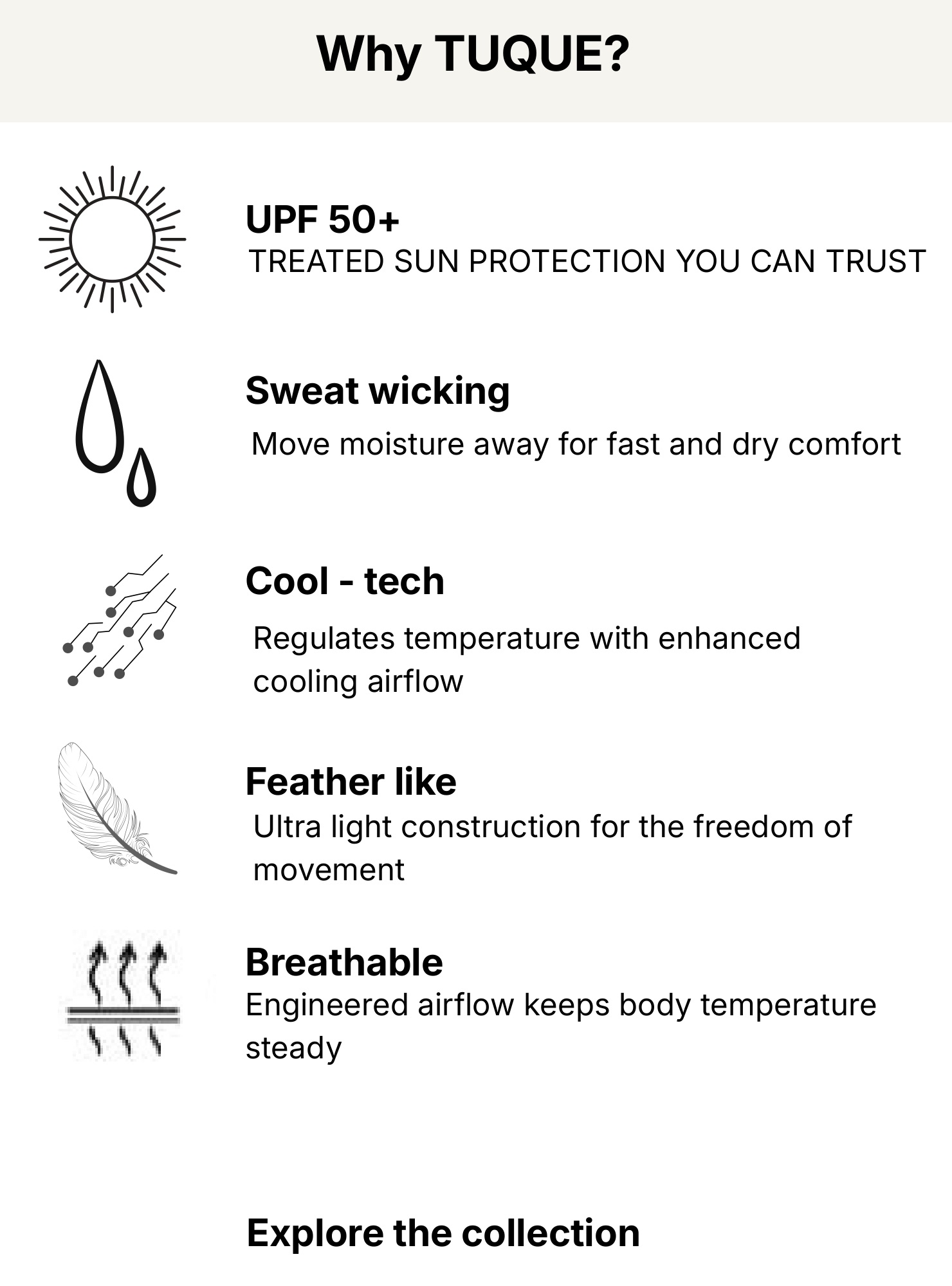 Tuque is built on a simple belief: protection should be part of everyday clothing. In places where sun and heat shape daily life, most clothing still treats protection as optional — or turns it into something overly technical. We believe it should be different. Tuque designs everyday activewear that feels natural to wear — lightweight, breathable, and considered — while offering the protection people actually need. Designed and made where heat is real, our pieces are shaped by lived conditions, not theory. Every detail serves a purpose. Nothing is added without reason. Tuque is made for movement that happens quietly, every day. Protection, without excess.